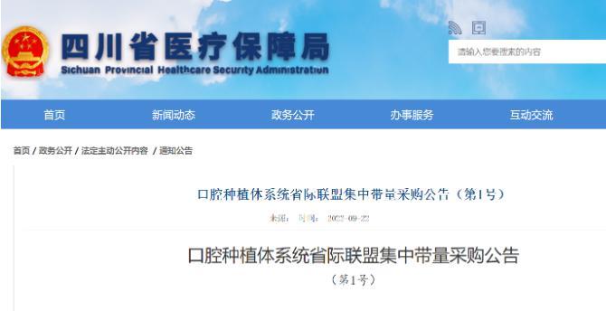9月23日,川觀新聞?dòng)浾邚乃拇ㄊ♂t(yī)保局了解到,四川省醫(yī)保局暨全國口腔種植體系統(tǒng)省際聯(lián)盟集中帶量采購辦公室,近日正式發(fā)布《口腔種植體系統(tǒng)省際聯(lián)盟集中帶量采購公告(第1號)》(以下簡稱《1號公告》),啟動(dòng)口腔種植體系統(tǒng)省際聯(lián)盟集中帶量采購(以下簡稱種植體系統(tǒng)集采)工作。