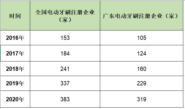 自2016年掀起的電動(dòng)牙刷熱仍在持續(xù)。據(jù)中用電器協(xié)會(huì)的數(shù)據(jù),2017年和2018年,國(guó)內(nèi)電動(dòng)牙刷銷售額分別達(dá)到32億元和48億元,同比增長(zhǎng)70%和50%。由此引發(fā)了巨頭入局、資本熱捧。天眼查數(shù)據(jù)顯示,2016年全國(guó)電動(dòng)牙刷新增注冊(cè)企業(yè)153家,2020年這一數(shù)字已經(jīng)達(dá)到383家,其中廣東企業(yè)占比超過8成。