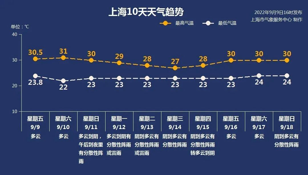 9月11日下午至9月12日,受高空槽和臺風外圍影響,將有分散性陣雨或雷雨,低氣溫23℃,高氣溫不超過30℃。