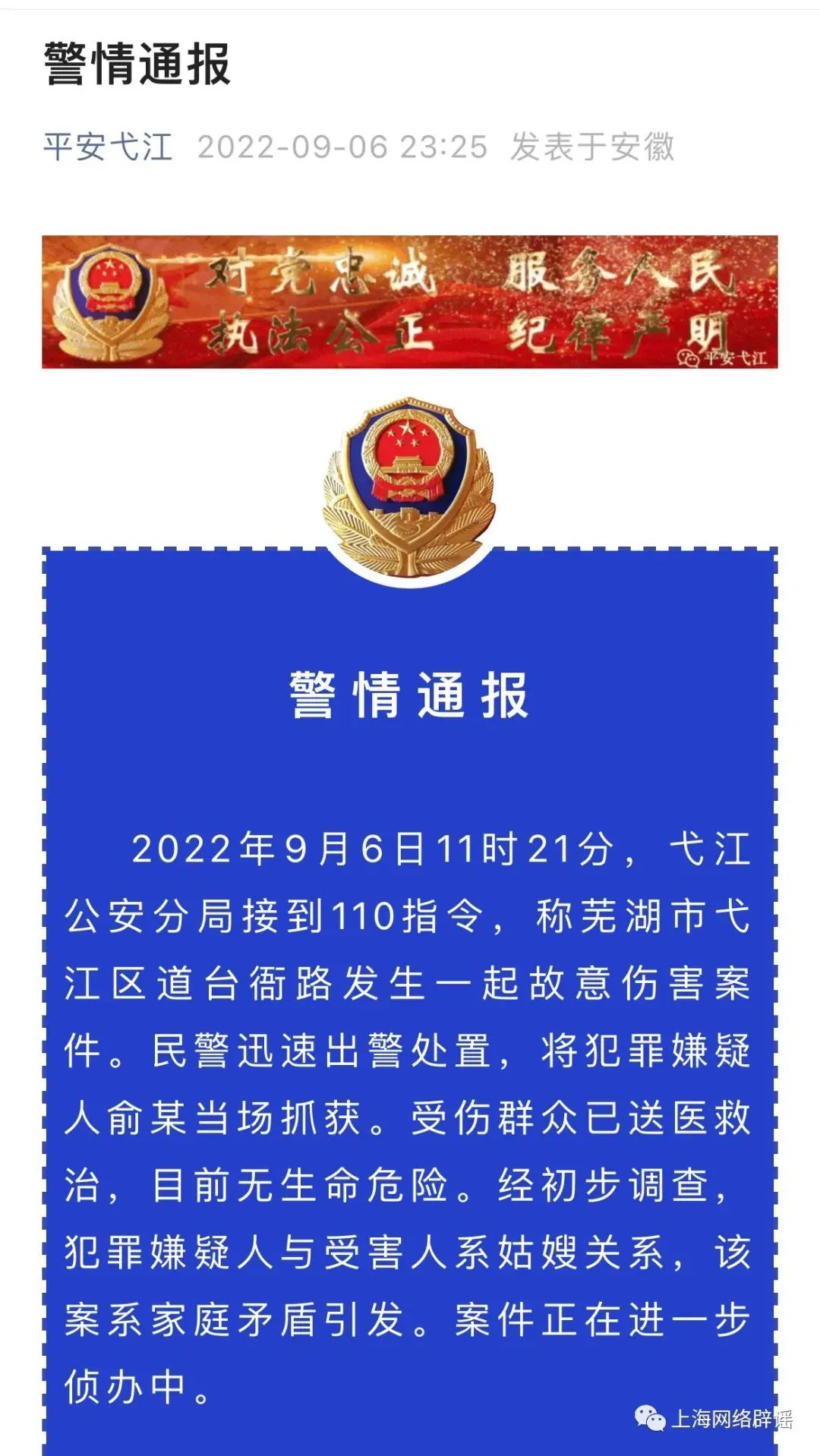 經核查,該視頻攝于9月6日蕪湖市弋江區(qū)延安小學附近。9月6日晚間,蕪湖市公安局弋江分局已通過官方微信發(fā)布警情通報。