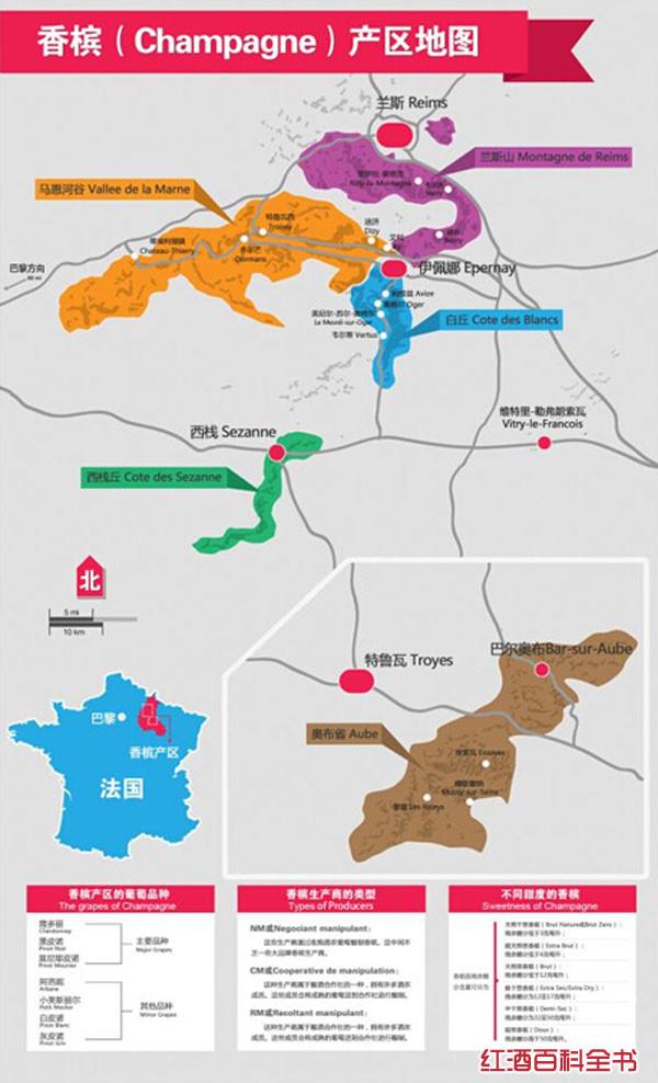 香檳產(chǎn)區(qū)共有5個子產(chǎn)區(qū),17個葡萄種植區(qū)。5個子產(chǎn)區(qū)包括: