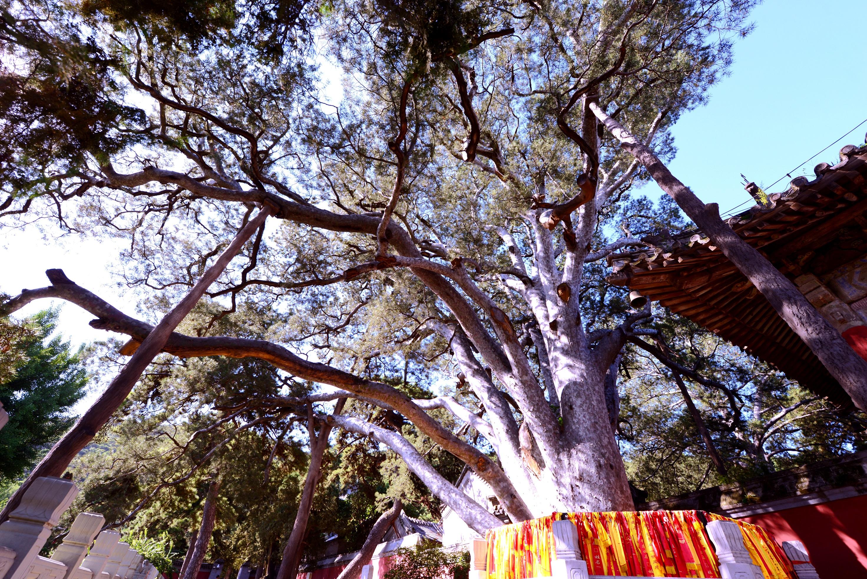 這是一棵白皮松,一級(jí)古樹(shù),胸圍650厘米,樹(shù)高18米,冠幅23米,樹(shù)齡約1300年,生長(zhǎng)在門(mén)頭溝區(qū)戒臺(tái)寺外院南門(mén)口。樹(shù)體雄偉壯觀,奇特的是樹(shù)的主干分九枝,樹(shù)干上鱗甲斑駁,霜皮半脫,宛如九條銀龍凌空飛舞,又似九條神龍?jiān)谑刈o(hù)著戒壇,故得此名“九龍松”。該樹(shù)為唐武德年間所植,是北京地區(qū)同樹(shù)種古老的一株,也是我國(guó)和世界上的“古白皮松之”。