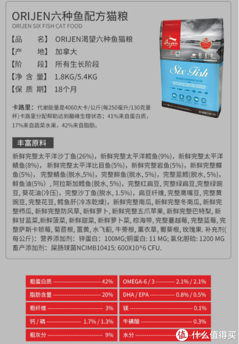 【渴望Orijen六種魚】渴望六種魚,在京東E寵上買過的低價(jià)是900元兩袋?,F(xiàn)在已經(jīng)找不到這么低的價(jià)格了。六種魚配方如下,可以看得到魚肉含量高達(dá)85%,粗蛋白42%。