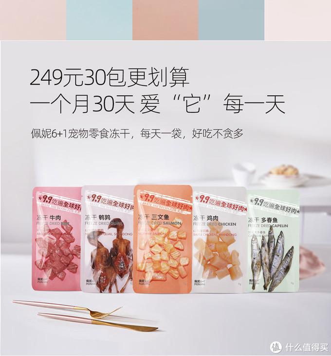 佩妮6+1零食凍干,雞肉、牛肉、多春魚、鵪鶉、三文魚五種口味,9.9元/包。