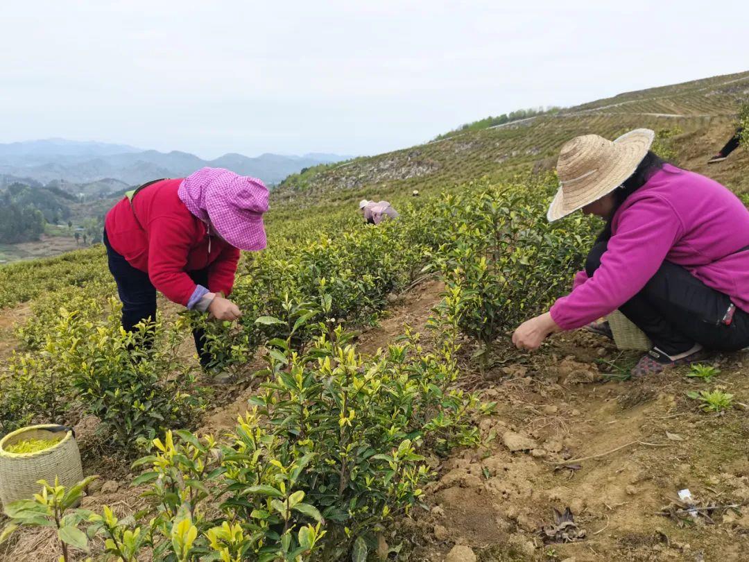 山坡上,100多名工人身背竹簍,正忙著采摘嫩綠的茶葉,綠野之中一片豐收盛景。