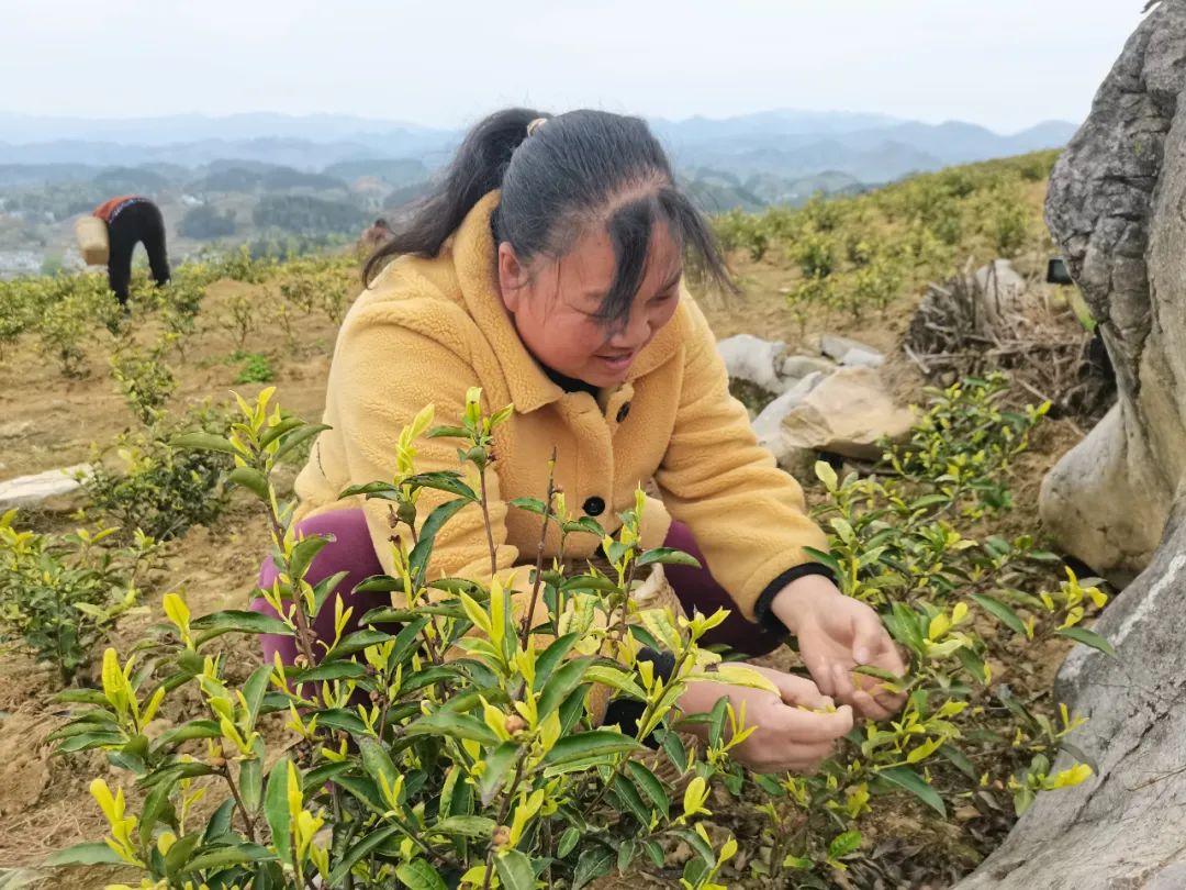 春風(fēng)送暖,綠茶飄香,如今正是明前茶采摘的黃金季節(jié)。走進(jìn)遵義市新蒲新區(qū)新舟鎮(zhèn)群樂村的黃金茶種植基地,放眼望去,整個茶園綠意蔥蘢,新芽迎春俏立,空氣中彌漫著清新茶香。