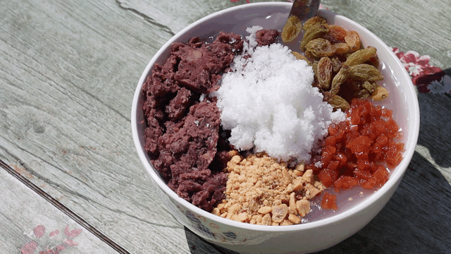 藕粉熱氣騰騰,上面放著香甜糯口的紅豆,香香的花生碎,酸甜的葡萄干和山楂糕粒,喝到嘴里,真是欲罷不能!重點是超便宜!
