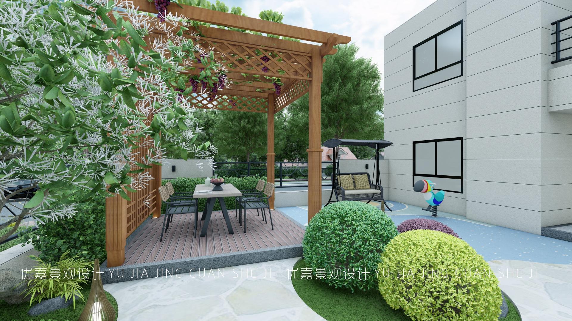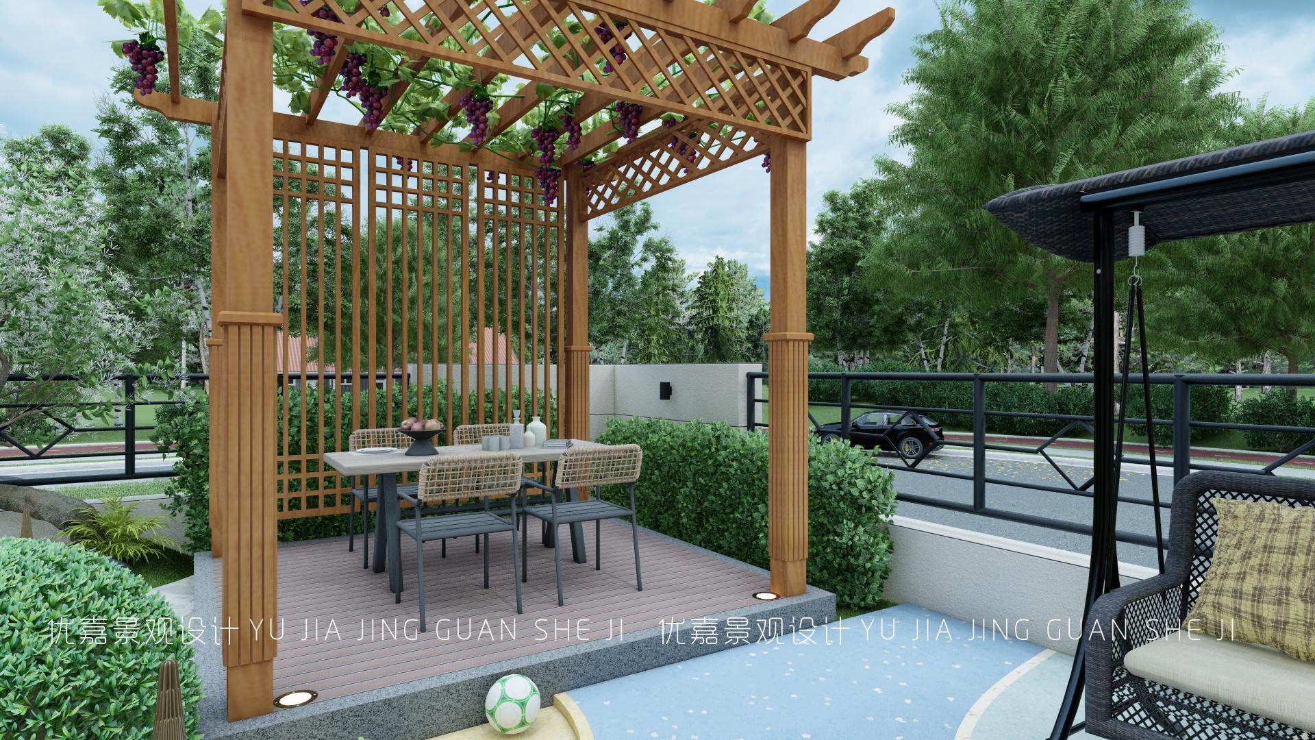 搭建防腐木廊架,擺放餐桌椅可以用來(lái)吃飯聊天休息等,坐在廊架內(nèi)的角度剛好可以欣賞到美的景色。