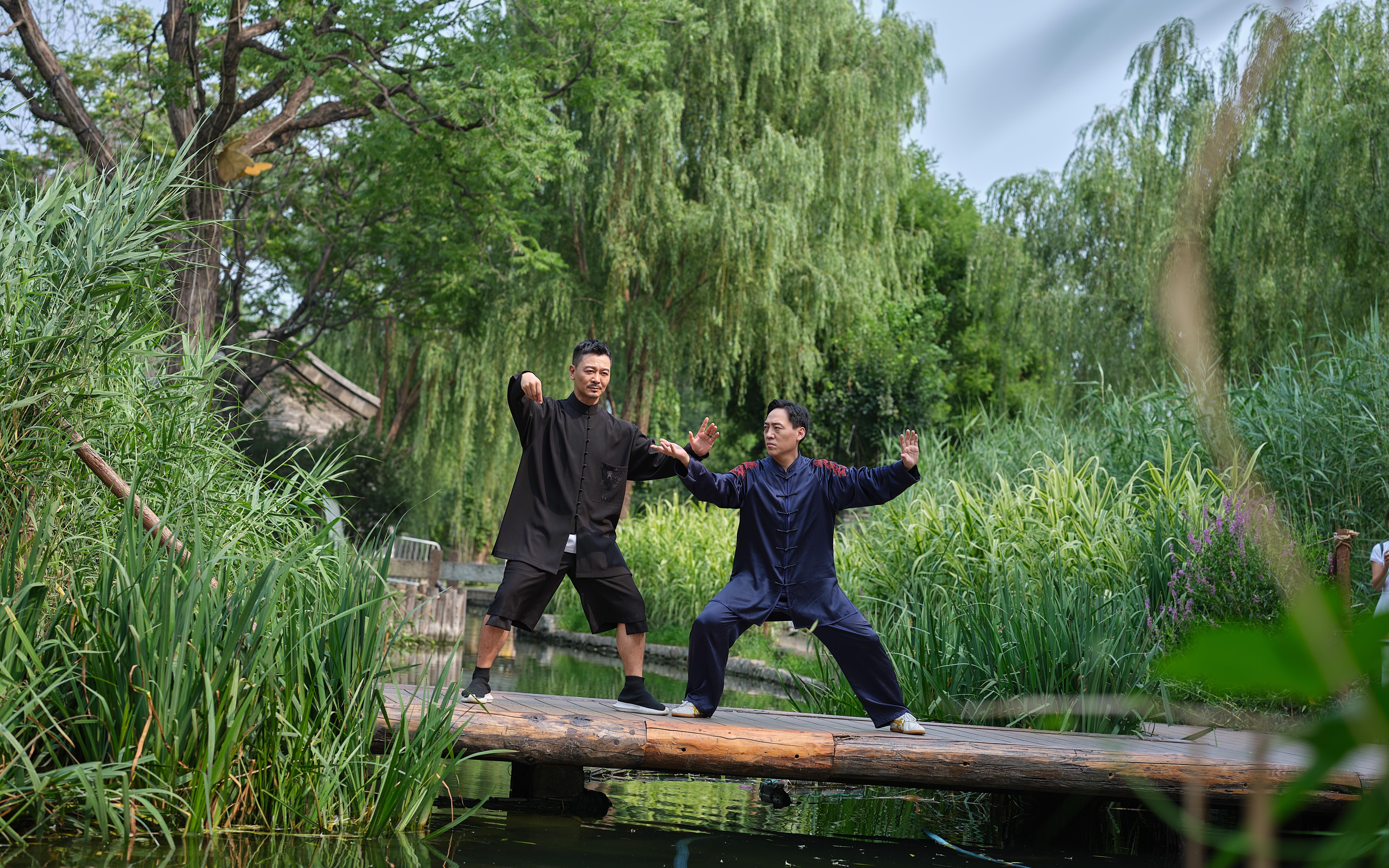 在小橋流水的景致下,吳樾(左)和陳斌演練太極拳。 新京報記者 郭延冰 攝