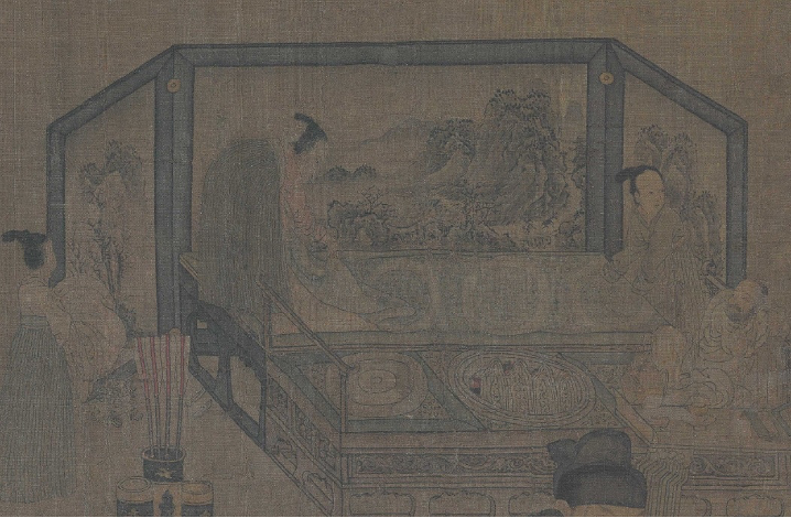 同樣,屏風(fēng)畫里白居易的《偶眠》詩意,也是用一連串的道具和仆人的活動(dòng),聯(lián)想主人公白衣隱士的一系列情節(jié):前面:書案上擺放著的卷冊(cè)和茶壺、茶碗,可知主人公此前曾啜茗讀書;中間:白衣隱士的夫人正在幫他脫去紗帽;后面:兩個(gè)女仆在鋪床,一個(gè)女仆抱來被褥,將要發(fā)生的情節(jié)是白衣居士要在這里進(jìn)入夢(mèng)鄉(xiāng)。三個(gè)情節(jié)發(fā)生的位置分別是前、中、后,將空間引向縱深的屏風(fēng)山水,與李璟等四人擺棋子的情節(jié)發(fā)生的位置左、中、右相交錯(cuò)。李璟等四人的活動(dòng)與屏中畫的情節(jié)均表現(xiàn)出,人物的活動(dòng)都發(fā)生在這個(gè)時(shí)間過程的中間段,兩者的繪畫構(gòu)思呼應(yīng)得十分得體。一千多年前的畫家有如此匠心,令人欽佩。這無疑是周文矩為李煜朝顧閎中畫《韓熙載夜宴圖》做出的的藝術(shù)鋪墊。
