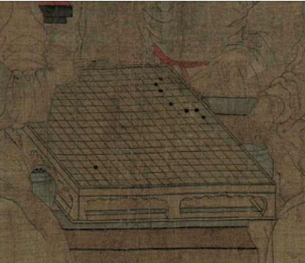 再看看觀棋和弈棋的座次,這正好是李家王朝繼位的順序:李璟→景遂→景達(dá)→景逿。這不會(huì)是偶然的巧合,而是中主李璟精心設(shè)計(jì)的結(jié)果,是繪畫構(gòu)思的一部分。畫中棋盤的布子進(jìn)一步說明了這個(gè)排序的人為因素和恒定性。