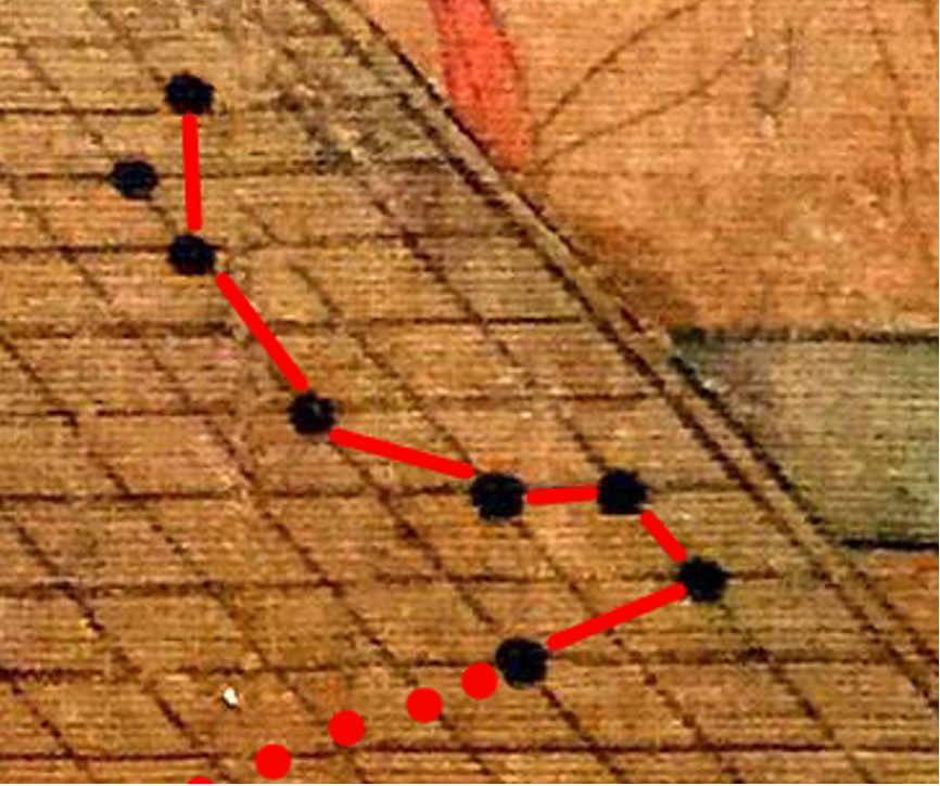 細(xì)細(xì)查看棋盤:景達(dá)執(zhí)白,景逿執(zhí)黑。他在左下角用一個(gè)黑子為星位座子,在對(duì)角又用另一個(gè)黑子為星位座子,另六個(gè)黑子擺出了一個(gè)長(zhǎng)蛇陣的組合。圍棋常識(shí)告知我們,這個(gè)“會(huì)棋”不會(huì)是棋局。我懷疑他是在擺一幅《天象圖》。我經(jīng)過多方請(qǐng)教圍棋高手和懂星象的朋友,這是一個(gè)不標(biāo)準(zhǔn)的北斗七星。哪兒不標(biāo)準(zhǔn)呢?差一個(gè)子兒嘛!那個(gè)子在哪里呢?我找啊找,在景逿的食指和中指間夾著一枚黑子,兩個(gè)手指正伸向六星之首,刨去占位的黑子,這正是地地道道的北斗七星,七星之首天樞星所面向左下方守角的那枚黑子就是北極星。從勺緣到勺柄尾端共計(jì)七顆星,即天樞、天璇、天璣、天權(quán)、玉衡、開陽、搖光,古希臘文字母依次是α、β、γ、δ、ε、ζ、η,聯(lián)接天璇星β和天樞星α的線延長(zhǎng)大約5倍處,可以尋找到北極星。故天璇β星和天樞α星又叫“指極星”。北極星在古代亦被稱為紫薇星,是蒼穹中的高星位,故將它稱為“帝星”,北斗七星圍繞著北極星運(yùn)轉(zhuǎn)。[圖4-8]畫中的李璟手執(zhí)記譜冊(cè),看得出,他對(duì)這個(gè)“棋局”的發(fā)展是滿意的,他要將這個(gè)布局記錄下來。