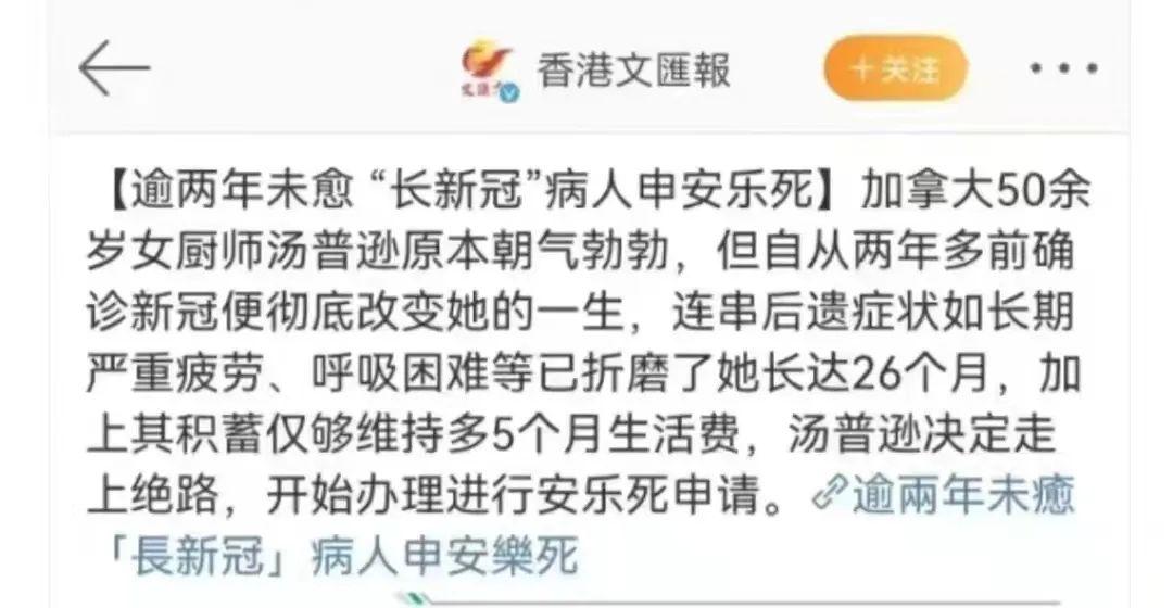 加拿大一名50歲的女廚師,在兩年前感染新冠后,受后遺癥折磨長達26個月,多年積蓄被醫(yī)療費耗盡,申請了這項“服務(wù)”。