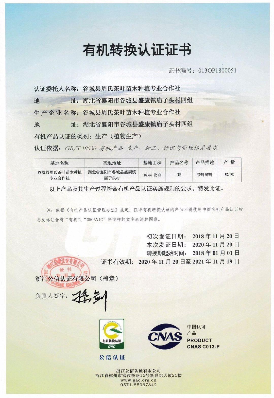 2018年獲得有機(jī)認(rèn)證,并被認(rèn)定為襄陽(yáng)市龍頭企業(yè);2021年加入地理標(biāo)志證明商標(biāo)“襄陽(yáng)高香茶”,成為襄陽(yáng)高香茶中獨(dú)具特色的茶葉品牌。