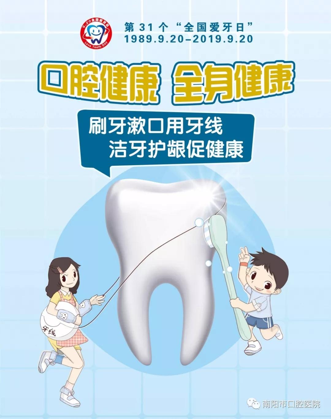 2019年9月20日是第31個(gè)“全國(guó)愛牙日”,主題是“口腔健康 全身健康”,副主題是“刷牙漱口用牙線 潔牙護(hù)齦促健康”。這個(gè)連續(xù)三年愛牙日的主題,今年再次登臺(tái),從中可見口腔健康在全身健康中的重要地位。