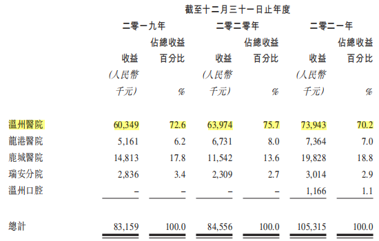 截至目前,中國口腔醫(yī)療擁有及運營5家位于溫州的民營牙科醫(yī)院,分別為溫州醫(yī)院、鹿城醫(yī)院、溫州口腔、瑞安分院、龍港醫(yī)院。其中溫州醫(yī)院2019-2021年(以下簡稱“報告期”)的收益分別為6034.9萬元、6397.4萬元、7394.3萬元,占營業(yè)收入的比例分別為72.6%、75.7%、70.2%;龍港醫(yī)院報告期內的營業(yè)收入分別為516.1萬元、673.1萬元、736.4萬元,分別占比6.2%、8.0%、7.0%;鹿城醫(yī)院的報告期內營業(yè)收入分別為1481.3萬元、1154.2萬元、1982.8萬元,分別占比17.8%、13.6%、18.8%;瑞安分院報告期內營業(yè)收入分別為283.6萬元、230.9萬元、301.4萬元,分別占比3.4%、2.7%、2.9%;溫州口腔2021年開始運營,去年實現(xiàn)收益116.6萬元,占比1.1%。