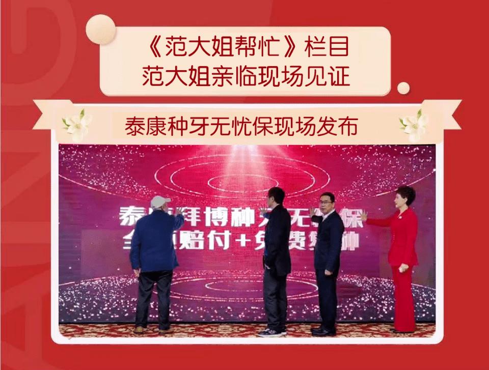 11月10日,由泰康拜博口腔與泰康在線聯(lián)合開發(fā)的“泰康種牙無(wú)憂?!痹谡憬┛蛋莶刂蓍T店開業(yè)活動(dòng)中正式在浙江推出。截至11月19日,義烏、杭州、舟山等地門店陸續(xù)發(fā)布“泰康種牙無(wú)憂保”,杭州的發(fā)布會(huì)現(xiàn)場(chǎng)還特別邀請(qǐng)浙江電視臺(tái)《范大姐幫忙》欄目當(dāng)家主持范大姐共同見證。