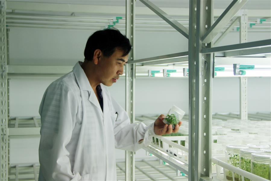 在太谷縣植物脫毒快繁育苗研究中心的植物培養(yǎng)室,研究人員在查看玻璃器皿中草莓苗的生長情況(1月2日攝)。新華社記者 王飛航 攝