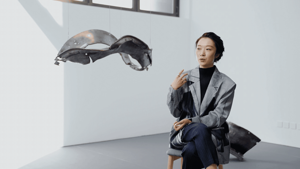 在個(gè)展現(xiàn)場接受一條的采訪,背后是她在貴州、甘肅、青海沿路找到的火箭殘骸