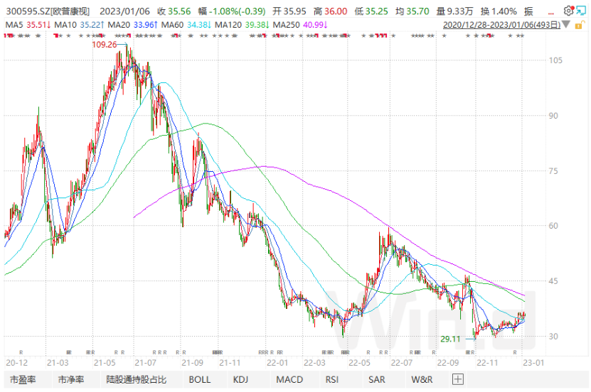 2017年初,A股“眼科茅”歐普康視(證券代碼:300596.SZ)登陸創(chuàng)業(yè)板,在國產(chǎn)OK鏡龍頭、高達90%的毛利率的加持下,歐普康視股價從2.3元一路狂奔至109.26元,高市值達到880億元。
