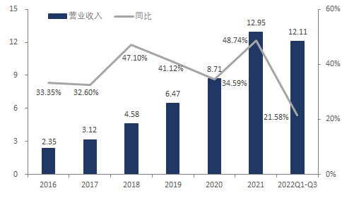 2016-2022Q3歐普康視營收及增速情況,單位:億元
