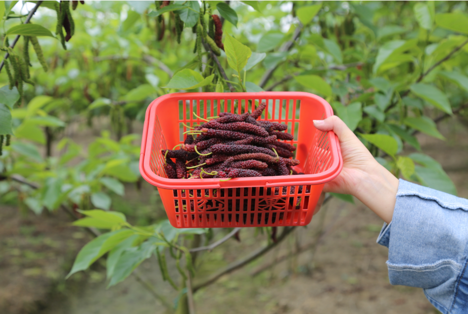 當前,蝶兒桑葚采摘園10余畝的桑葚已經(jīng)進入成熟期,綠葉蔥蘢間,紫黑的顏色瞬間勾起童年的記憶,一把一把吃的痛快,以及紫黑色的指甲和牙齒,喜歡得緊又討厭得很。