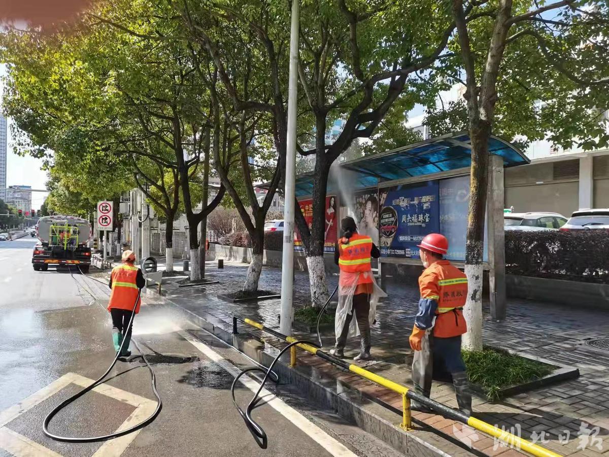 環(huán)衛(wèi)工人沖洗城區(qū)公交站臺