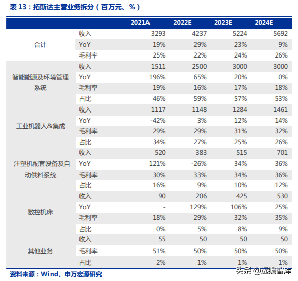 智能能源及環(huán)境管理業(yè)務(wù)處于制造業(yè)生產(chǎn)前端,可以幫助拓斯達了解下游客戶的生產(chǎn)工藝和規(guī)劃,與客戶建立密切的聯(lián)系,有利于公司對客戶銷售工業(yè)機器人、注塑機、數(shù)控機床等自動化設(shè)備和自動化解決方案,形成協(xié)同應(yīng)。