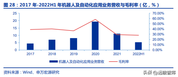 2021 年工業(yè)機器人&集成業(yè)務(wù)實現(xiàn)營業(yè)收入 11.17 億元,占總收入比重為 34%。毛利率 29%。2020 年該業(yè)務(wù)的收入和毛利率有一定脈沖式增長,主要由于口罩機及相關(guān)設(shè)備銷售貢獻約 13 億元收入,且毛利率高達 69.4%,該業(yè)務(wù) 2021 年及以后基本終止。