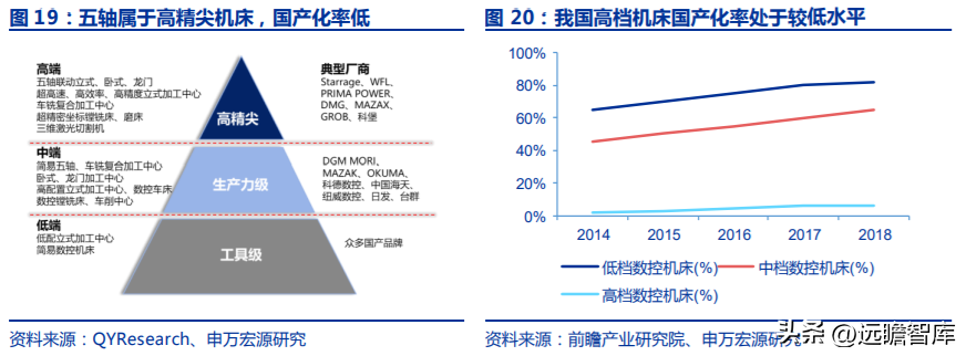 根據(jù)前瞻研究院數(shù)據(jù),2018 年我國低檔數(shù)控機床國產(chǎn)化率約 82%,中檔數(shù)控機床國產(chǎn)化率約 65%,數(shù)控機床國產(chǎn)化率僅約 6%。
