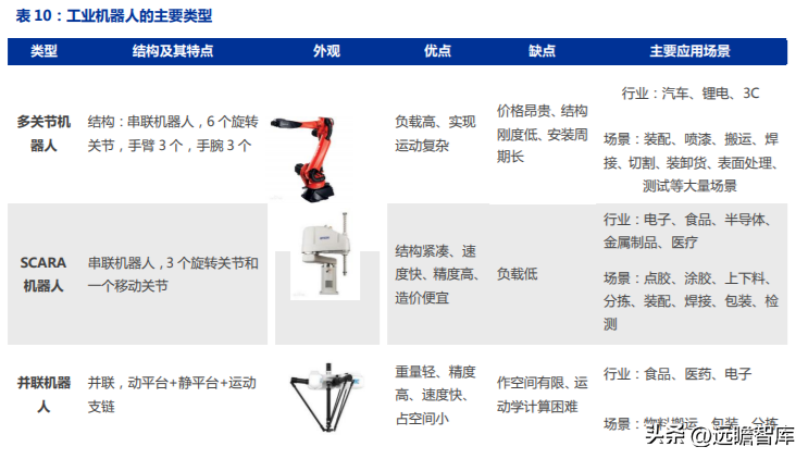 按照結(jié)構(gòu)來分,工業(yè)機器人主要包括多關(guān)節(jié)機器人、SCARA 機器人、并聯(lián)機器人、直角坐標(biāo)機器人、協(xié)作機器人;按應(yīng)場景分,包括焊接、噴涂、搬運、潔凈、裝配機器人。