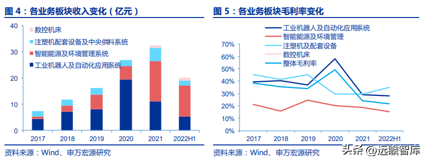 注塑機業(yè)務(wù)的收入規(guī)模和毛利率有望持續(xù)提升。2021 年公司的注塑機業(yè)務(wù)收入為 5.2 億元(不包括機械手),占總收入份額為 15.8%,同比增長 121%,毛利率 29.72%,收入大幅增長的原因為 2021 年注塑機主機業(yè)務(wù)貢獻收入 2.3 億元,2020 年僅為 0.7 億元。