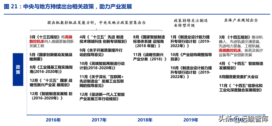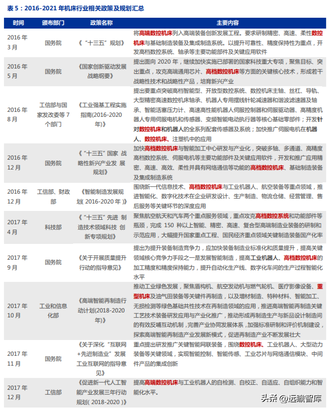 從角度出發(fā),實現(xiàn)高端機床的自主可控是中國機床行業(yè)發(fā)展的必然要求。從 2016 年以來,持續(xù)出臺相關(guān)政策加快機床全產(chǎn)業(yè)鏈發(fā)展。2016 年 3 月,“十三五”規(guī)劃將高端數(shù)控機床列入高端裝備創(chuàng)新發(fā)展工程,而后中央及地方密集出臺相關(guān)政策。政策覆蓋全產(chǎn)業(yè)鏈環(huán)節(jié)、零部件性能、產(chǎn)業(yè)目標(biāo)等全方面,助力我國數(shù)控機床全產(chǎn)業(yè)鏈快速崛起,逐漸縮短與日德等發(fā)達之間的差距。