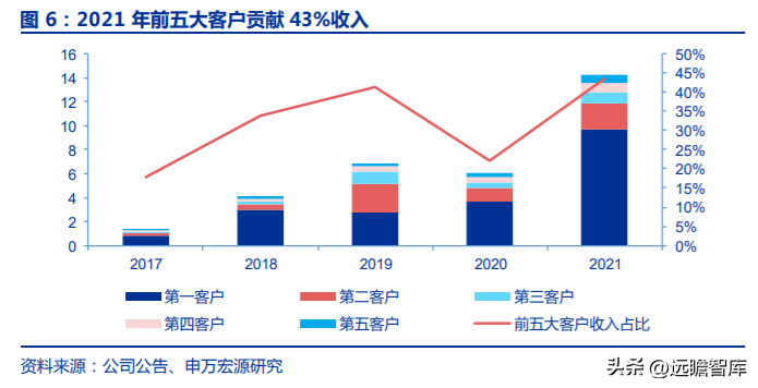 2021 年前五 大客戶分別貢獻收入 9.7 億元、2.2 億元、8650 萬元、7801 萬元和 7009 萬元,合計占收 入比重 43.23%。各賽道具有結(jié)構(gòu)性機遇和長期發(fā)展空間,持續(xù)貢獻增量。