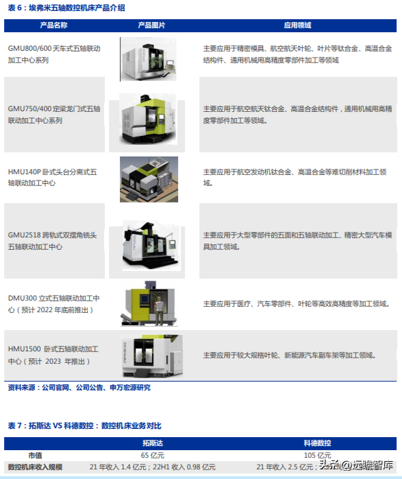 目前多款機床產(chǎn)品處于研發(fā)階段,根據(jù)公司 2022 年半年報,2022 年下半年將推出 DMU300 立式五軸聯(lián)動加工中心,主要應(yīng)用于醫(yī)療、汽車零部件、葉輪等高高精度等加工領(lǐng)域;預(yù)計 2023 年推出 HMU1500 臥式五軸聯(lián)動加工中心,主要應(yīng)用于較大規(guī)格葉輪、新能源汽車副車架等加工領(lǐng)域。