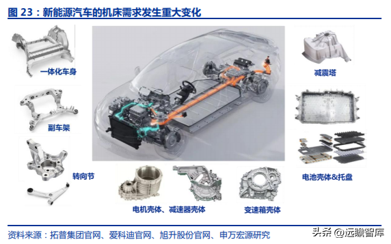 新能源汽車三電系統(tǒng)的零部件及加工方式發(fā)生巨變:電池托盤、電池殼體、電機殼體、電機端蓋、電機變速箱端蓋/底殼、電控外殼和電控箱上蓋成為主要零件。
