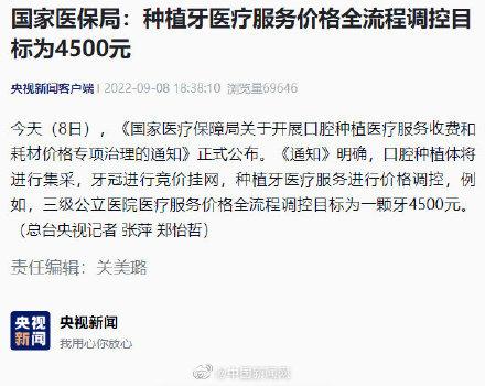 今天(8日),《醫(yī)療保障局關(guān)于開展口腔種植醫(yī)療服務(wù)收費(fèi)和耗材價格專項治理的通知》正式公布。《通知》明確,口腔種植體將進(jìn)行集采,牙冠進(jìn)行競價掛網(wǎng),種植牙醫(yī)療服務(wù)進(jìn)行價格調(diào)控,例如,三級公立醫(yī)院醫(yī)療服務(wù)價格全流程調(diào)控目標(biāo)為一顆牙4500元。(新聞客戶端)
