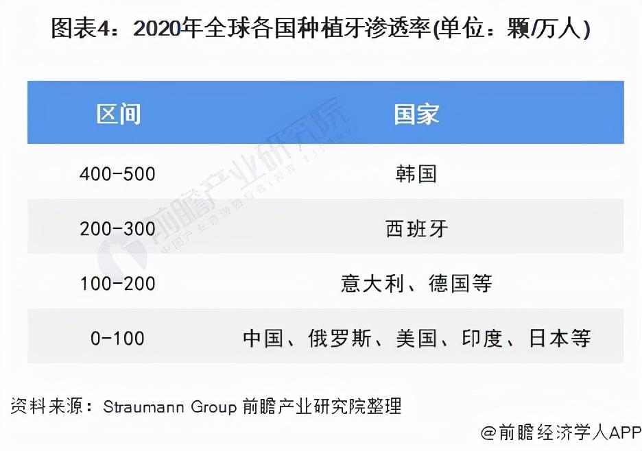 近年來我國種植牙市場迎來高速增長,2011年我國種植牙數(shù)量僅有13萬顆,2020年我國種植牙數(shù)量已達到約406萬顆,處于滲透率快速提升的階段。但相較于韓國、西班牙等,我國種植牙滲透率仍然處于低位,2020年我國種植牙滲透率約29顆/萬人(種植牙數(shù)量/人口總數(shù)),而韓國的種植牙滲透率已經(jīng)接近500顆/萬人,我國種植牙市場還有較大發(fā)展空間。