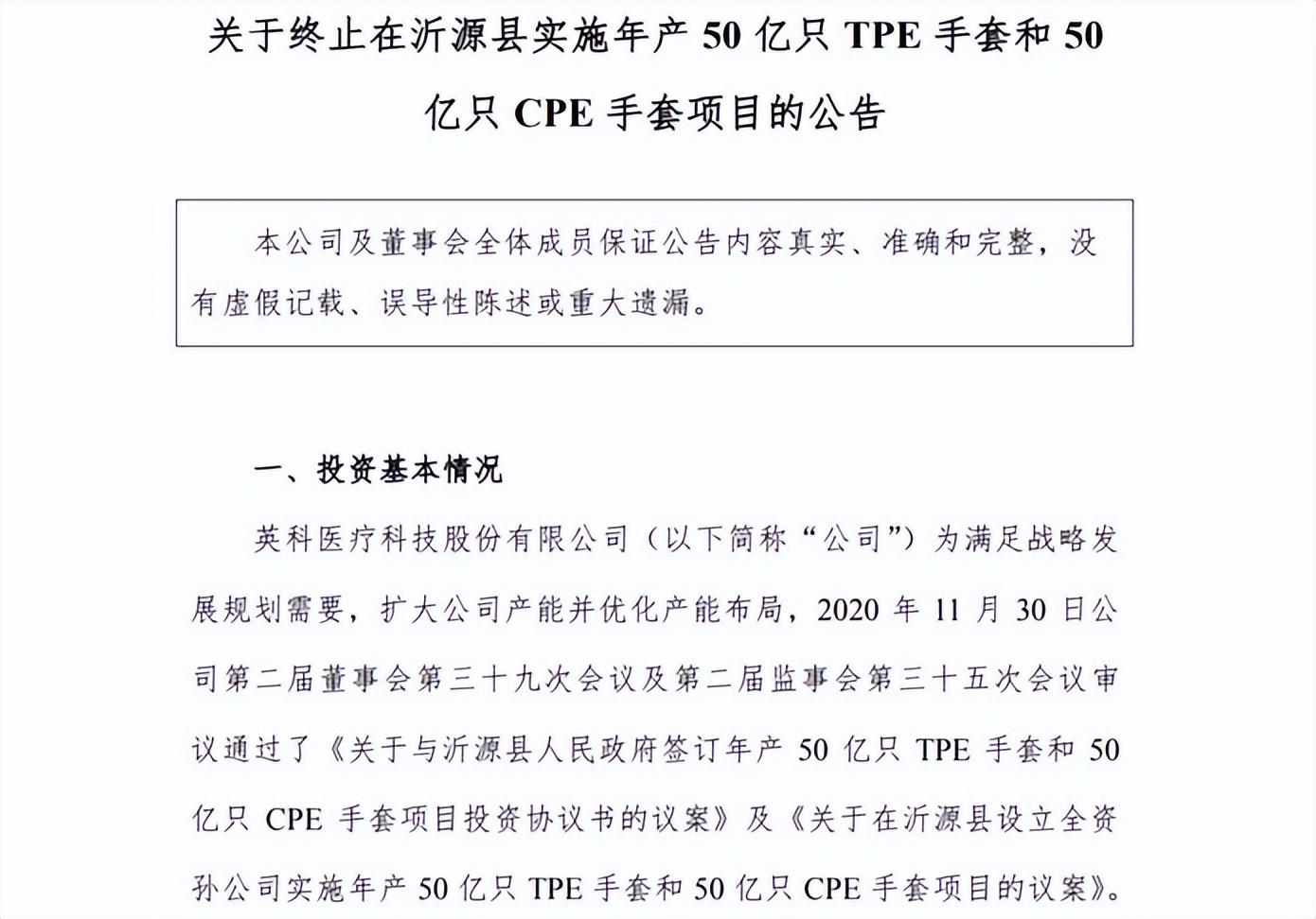 12月19日,英科醫(yī)療公告,根據(jù)目前市場及行業(yè)的情況,公司綜合考慮各方面因素后,為優(yōu)化公司資源配置,降低投資風險,維護公司及股東利益,公司決定調整戰(zhàn)略,與沂源縣人民政府友好協(xié)商,簽訂《投資協(xié)議書之解除協(xié)議》,擬終止年產(chǎn)50億只TPE手套和50億只CPE手套項目。