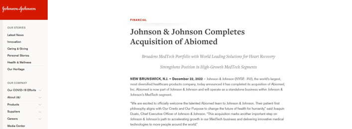 12月22日,強生公司宣布已完成對Abiomed,Inc.的收購,總收購金額約166億美元。據(jù)悉,該交易不會對兩家公司2022年的財務業(yè)績產(chǎn)生重大影響。