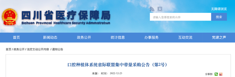 12月23日,四川省醫(yī)保局官網(wǎng)發(fā)布《口腔種植體系統(tǒng)省際聯(lián)盟集中帶量采購公告(第2號)》(以下簡稱《2號公告》),公布口腔種植體系統(tǒng)省際聯(lián)盟集中帶量采購文件。