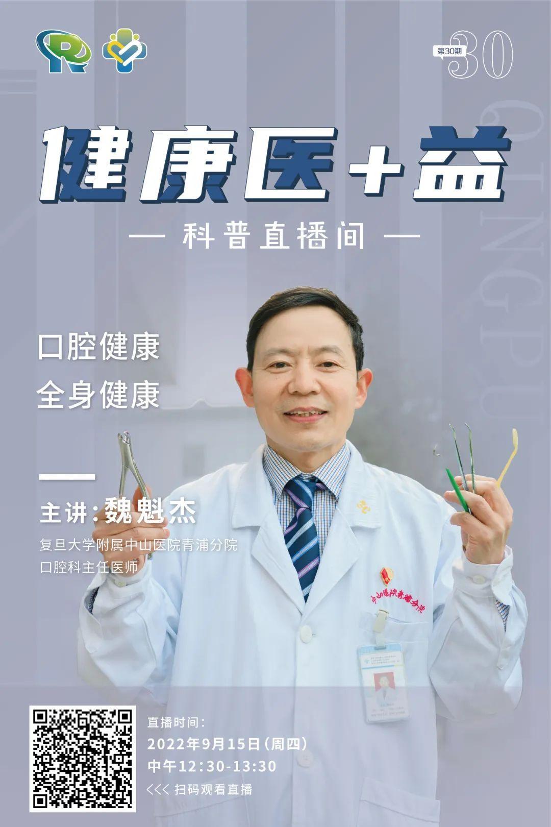 9月20日是全國(guó)第34個(gè)“全國(guó)愛(ài)牙日”,今年愛(ài)牙日的主題是“口腔健康全身健康,護(hù)牙健齒少年強(qiáng),健康中國(guó)民族興”。那么口腔健康與全身健康有哪些聯(lián)系呢?第三十期“健康醫(yī)+益”科普直播重磅來(lái)襲!復(fù)旦大學(xué)附屬中山醫(yī)院青浦分院口腔科主任、主任醫(yī)師魏魁杰做客直播間,為您詳細(xì)解讀!