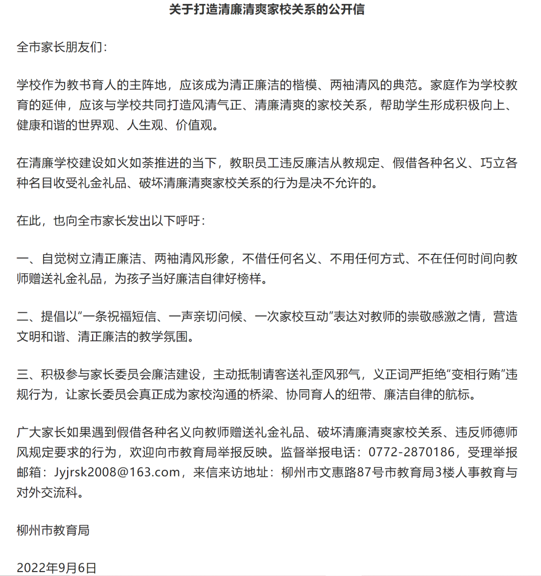廣大家長如果遇到假借各種名義向教師贈(zèng)送禮金禮品、破壞清廉清爽家校關(guān)系、違反師德師風(fēng)規(guī)定要求的行為,歡迎向市教育局舉報(bào)反映。監(jiān)督舉報(bào)電話:0772-2870186,受理舉報(bào)郵箱:Jyjrsk2008 163.com,來信來訪地址:柳州市文惠路87號(hào)市教育局3樓人事教育與對(duì)外交流科。