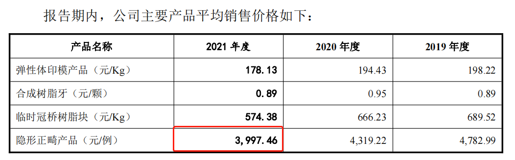 據(jù)滬鴿口腔招股書顯示,2021年公司隱形正畸產(chǎn)品的平均售價為3997.46元/例,近幾年平均售價呈現(xiàn)逐年下降的趨勢,其中有技術(shù)升級和規(guī)模提升的原因,更重要的是公司采用競爭性的市場策略獲取更多銷售份額,隱形正畸產(chǎn)品收入從2019年的942.62萬提升至2021年的2278.99萬。