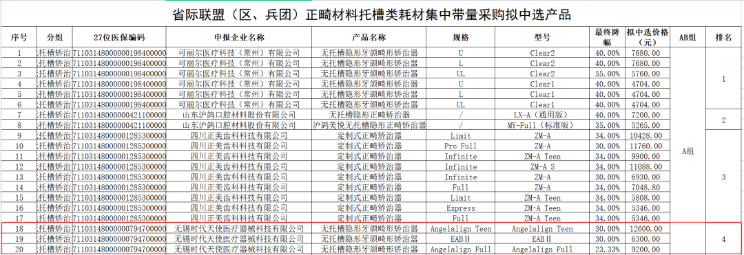 1、時代天使逆勢上漲,本次集采是否符合預(yù)期?集采結(jié)果顯示:時代天使排列在A組的第四名,并且有三款產(chǎn)品擬中選,分別為Angelalign Full、Angelalign Teen和EAB II。