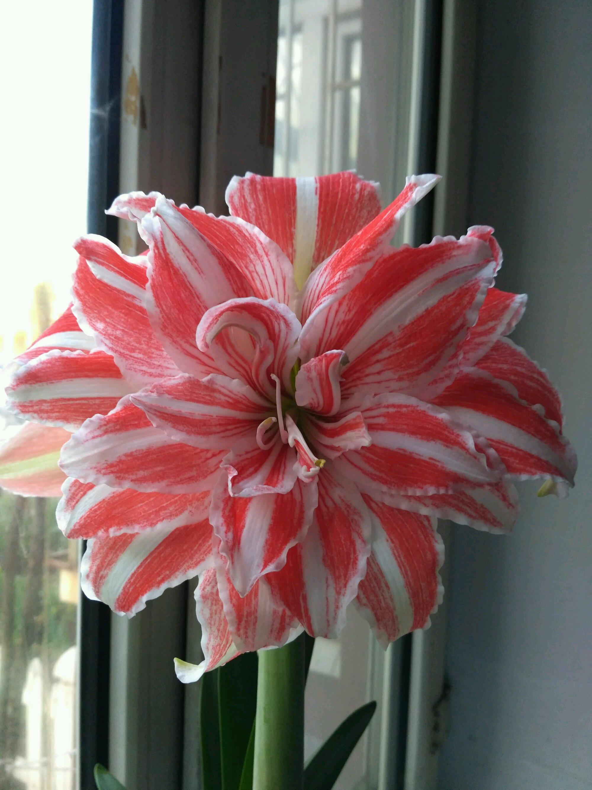 舞后的葉子是綠油油的,表面光滑翠綠,像抹了油一般亮晶晶,生機(jī)勃勃,在沒(méi)有開(kāi)花的時(shí)候能當(dāng)觀葉植物欣賞,不過(guò)還是以觀花為主——花桿從鱗莖處高高抽出,比葉子高處許多,頂部著花2~8朵,朝著四個(gè)方向開(kāi)放,花型重瓣,大中型花,直徑能達(dá)到25cm,花型和大麗花有點(diǎn)像,花姿優(yōu)雅美麗,有磅礴威武之勢(shì),花色為白色,并帶紅色的條紋,在陽(yáng)光的照耀下,格外亮麗,閃亮亮的,很是吸引人眼球,有著很高的觀賞價(jià)值。