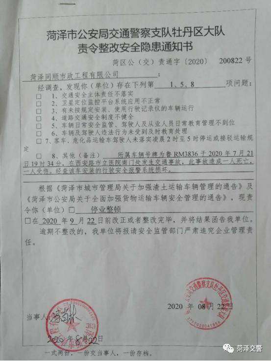 8月22日,菏澤市交通警察支隊牡丹區(qū)大隊約談菏澤同順市政工程有限公司負責(zé)人,強調(diào)駕駛的重要性,要求公司落實主體責(zé)任主體,加強交通知識培訓(xùn)工作,并對肇事車輛魯RM3836號渣土運輸貨車在行駛報警系統(tǒng)損壞的情況下依然從事貨物運輸行為提出整改意見。要求菏澤同順市政工程有限公司舉一反三杜絕類似問題再次發(fā)生,約談會當(dāng)場向菏澤同順市政工程有限公司下達責(zé)令整改隱患通知書責(zé)令同順市政工程有限公司停業(yè)整頓。