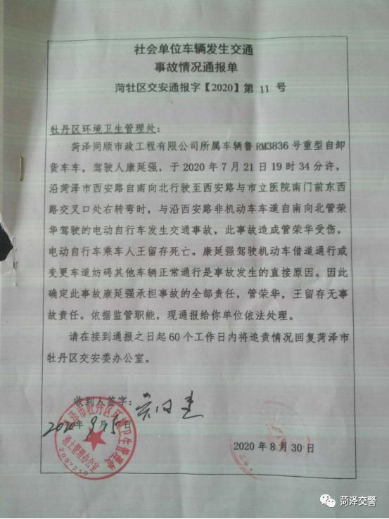 菏澤市交通警察支隊牡丹區(qū)大隊及時將該事故調(diào)查情況上報菏澤市牡丹區(qū)交安委,要求相關(guān)主管部門對同順市政工程有限公司監(jiān)管職責(zé)執(zhí)行不到位的問題作出處理,9月15日牡丹區(qū)交安委向牡丹區(qū)環(huán)境衛(wèi)生管理處下達社會單位車輛發(fā)生交通事故情況通報單要求牡丹區(qū)環(huán)境衛(wèi)生管理部門對同順市政工程有限公司相關(guān)調(diào)查處理工作。