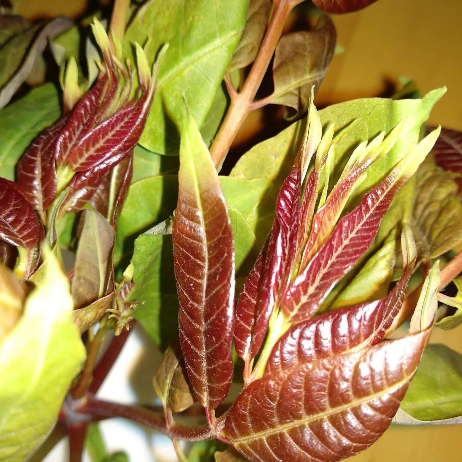 香椿,廣布中國南北各地,以河南信陽種植為馳名。食用香椿一般有紫香椿和綠香椿兩種,紫色香椿氣味尤甚。