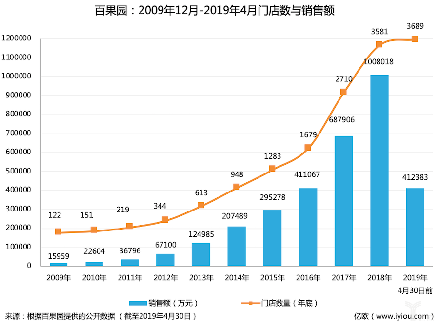 百果園2009年12月-2019年4月門店數(shù)與銷售額